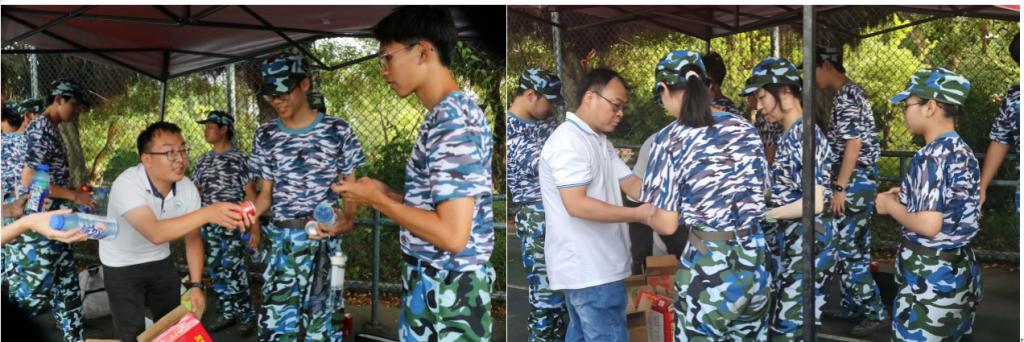 在慰问活动期间,学院老师一行向承训教官和同学们送上了解暑慰问品。新生们畅饮着学院精心准备的王老吉、脉动等解暑饮品,在欢笑与清凉中缓解了高温下训练的疲劳与不适,和老师们的现场交流,也让他们深切感受到了学院的关怀,坚定了高质量完成军训任务的决心。
