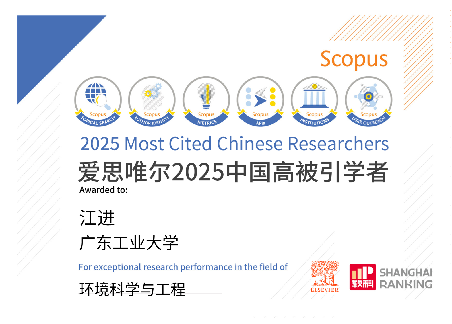 爱思唯尔“中国高被引学者”榜单呈现基于Scopus学者档案,采用多种指标,系统性地呈现中国学者在学科领域内的科研贡献与创新价值。依托学者长期学术成果的引文数据沉淀,以可视化的科研影响力分析,助力学者在细分领域内构建独特的学术标识,提升其研究成果在学术界及产业界的认可度,为学术声誉的全球化传播奠定坚实基础.