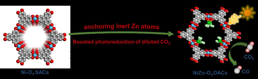 利用太阳能将二氧化碳(CO2),尤其是人为源的低浓度CO2直接转化为高附加值化学品(如CO),是应对能源和气候危机的理想方案。然而,C=O键的高解离能、受限的光生电荷分离效率,以及在低CO2浓度下其他组分的竞争吸附,导致CO2难以在催化剂表面吸附和活化,限制了反应的活性和选择性。研究团队成功构建了一种基于导电金属有机框架(CMOF)的镍-锌双原子催化剂(NiZn-O4DACs),该催化剂利用惰性Zn位点与活性Ni位点的协同作用,实现了高效、高选择性光催化还原人为源低浓度CO2。当Ni/Zn比例为4:1时,NiZn-O4DACs在纯CO2气氛中实现了20.17 μmol h-1的CO生成速率,选择性达到97%,优于镍单原子催化剂(Ni-O4SACs)以及大多数已报道的体系。此外,在人为源低浓度CO2(10%)中,NiZn-O4DACs的CO选择性仍能保持在94%,而Ni-O4SACs的CO选择性则明显下降(从95%降至88%)。光电化学测试表明,Zn位点的引入促进了光生电子-空穴对的分离和迁移,提高了电荷分离与传输效率。理论计算结果进一步揭示,通过引入惰性的Zn位点,有效调节了邻近Ni活性中心的电子结构,加速了电子转移,提升了还原动力学,显著降低了形成关键中间体*COOH所需的能垒。这项工作深入阐明了DACs中惰性金属位点与活性位点之间的协同作用机制,为开发适用于特定应用场景的高效DACs提供了理论依据与参考。