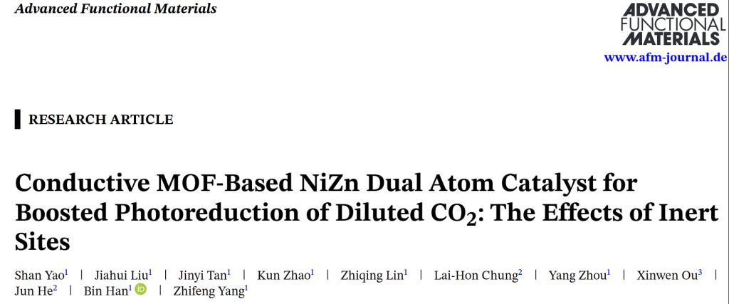 杨志峰院士团队韩彬教授课题组在人为源二氧化碳转化研究中取得重要进展,研究成果以“Conductive MOF-Based NiZn Dual Atom Catalyst for Boosted Photoreduction of Diluted CO2: The Effects of Inert Sites”为题发表于《Advanced Functional Materials》。韩彬教授为论文通讯作者,av影片中文