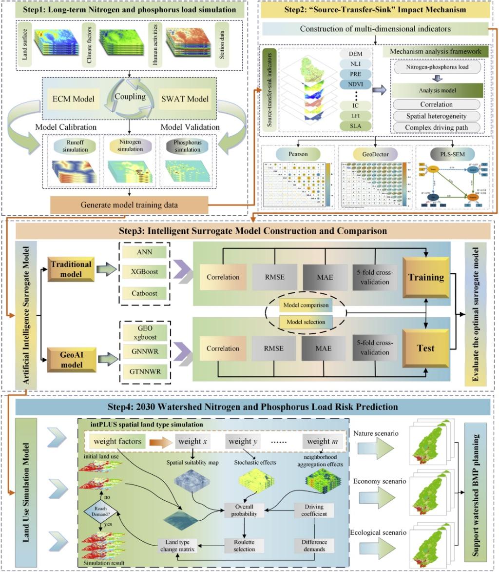 2.研究提出“ECM-SWAT提供训练样本+ GeoAI建模”的新方法,用过程模型弥补长期监测样本不足,再由GeoAI实现快速、高精度模拟,为流域面源污染管理和情景预测提供了兼顾精度和效率的代理模型。